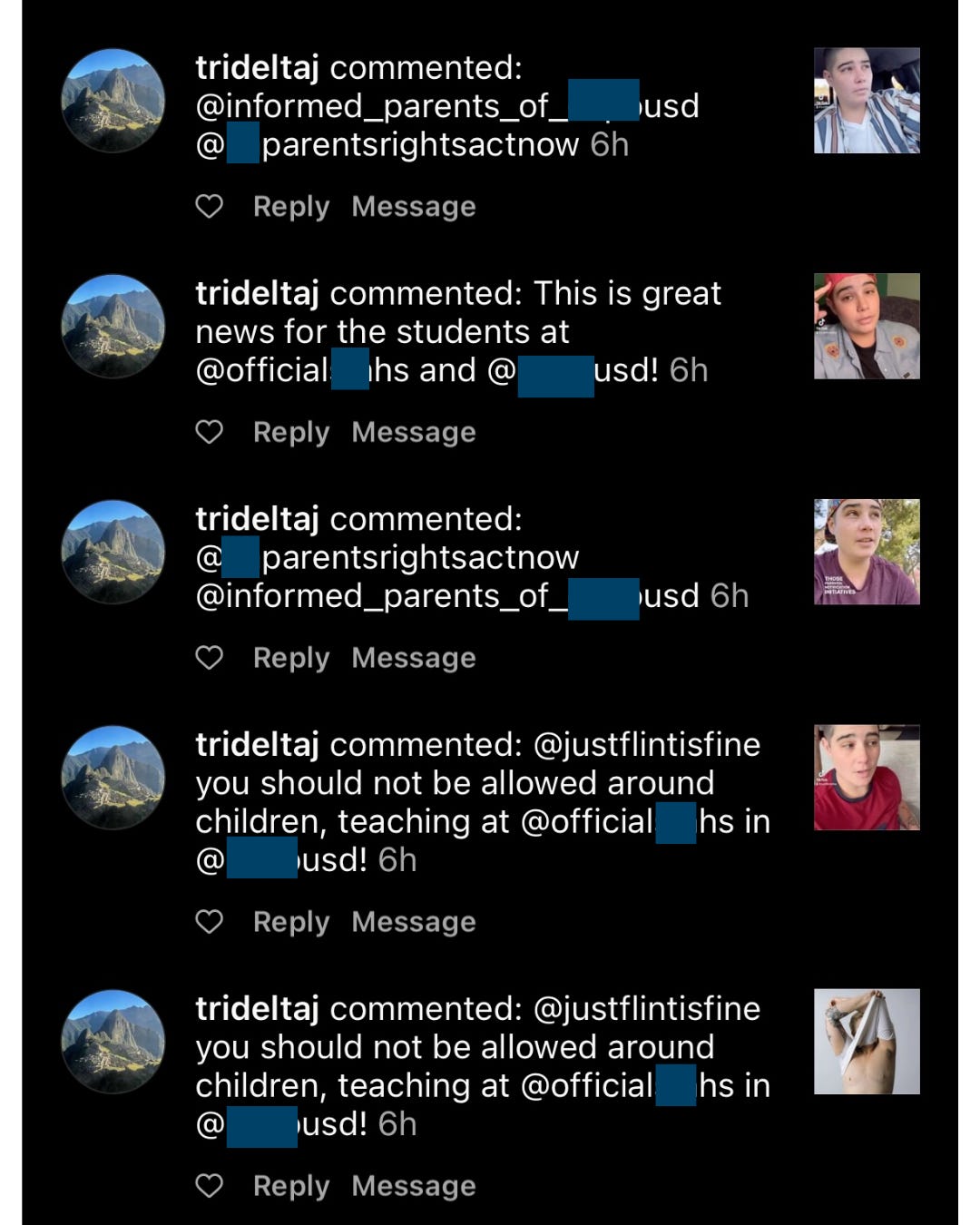 Parent harassment continues online. Posts about my teaching at my school appear on Facebook groups for parents in my district, misgendering me, deadnaming me, asserting that I am a danger to their children, and that I should not be allowed to teach. An Instagram account for parents in my district posts photos of me with my deadname and my school. No admin action is taken, and the district continues its silence.