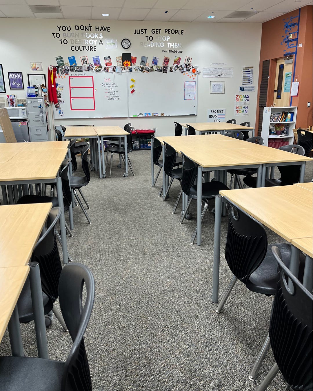 Several meetings are held between my administration, myself, and HR. Fifteen LGBTQ+ books are removed from my classroom library by district representatives, though I am assured that I have not violated any district guidelines or policies. I am told I can no longer film videos for social media on campus, though I have never filmed during school hours, with any campus-identifying features, or visible students. No other teachers are asked to follow this policy, no other classroom libraries are searched, and no other books are removed from any other place on campus. The only specific accommodation for my safety I am offered is an escort to and from my car.