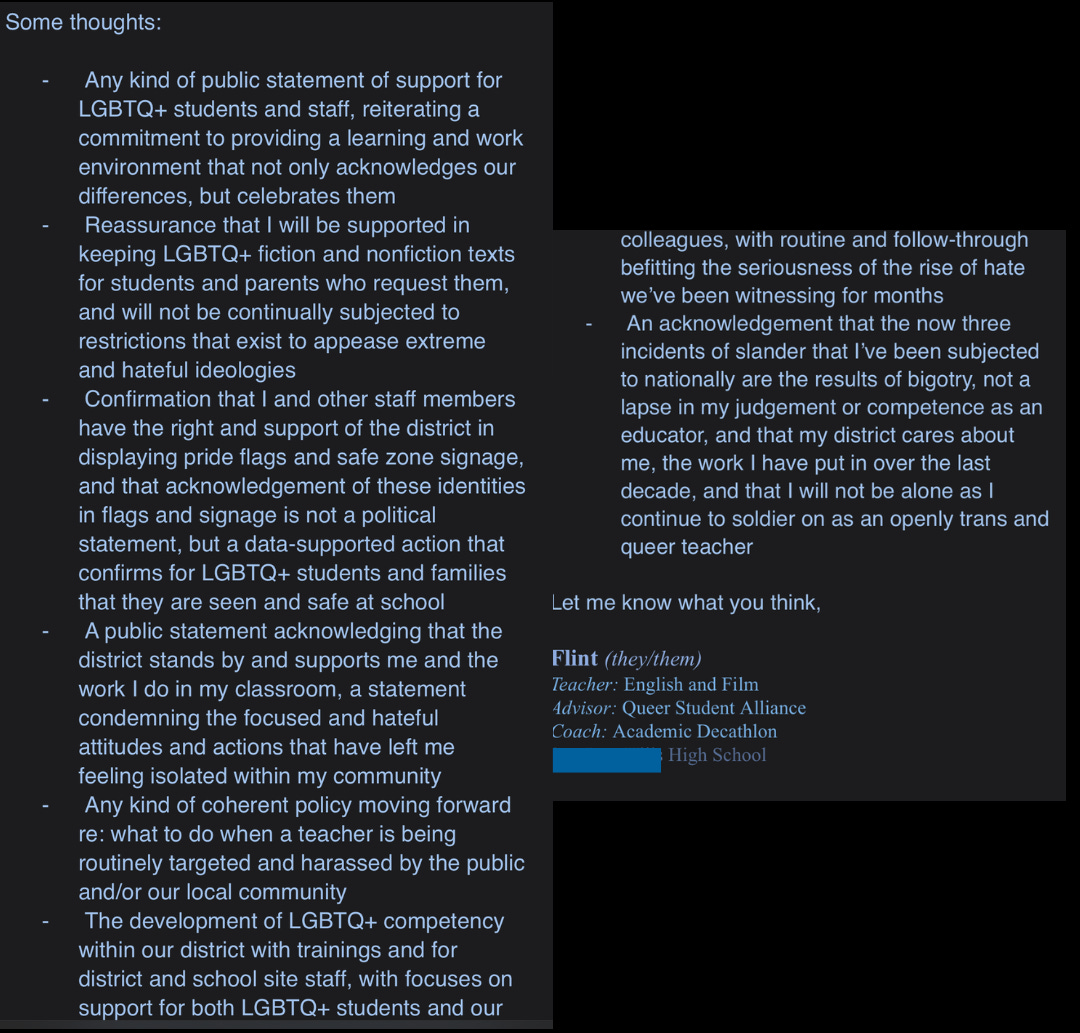The bomb threat is made public in the following week, and during a public school board meeting, several parents again assert that LGBTQ+ literature is pornography. The district makes no statement in my support, and again I am told privately that I have not violated any district policy. My district email address is changed for the first time, and is no longer listed publicly.