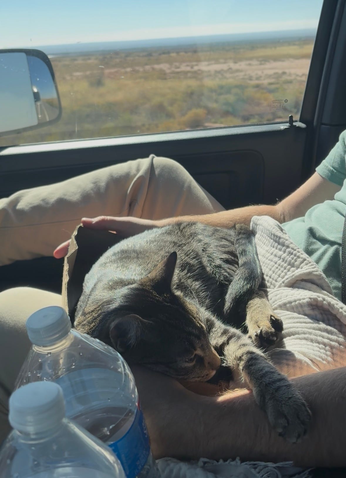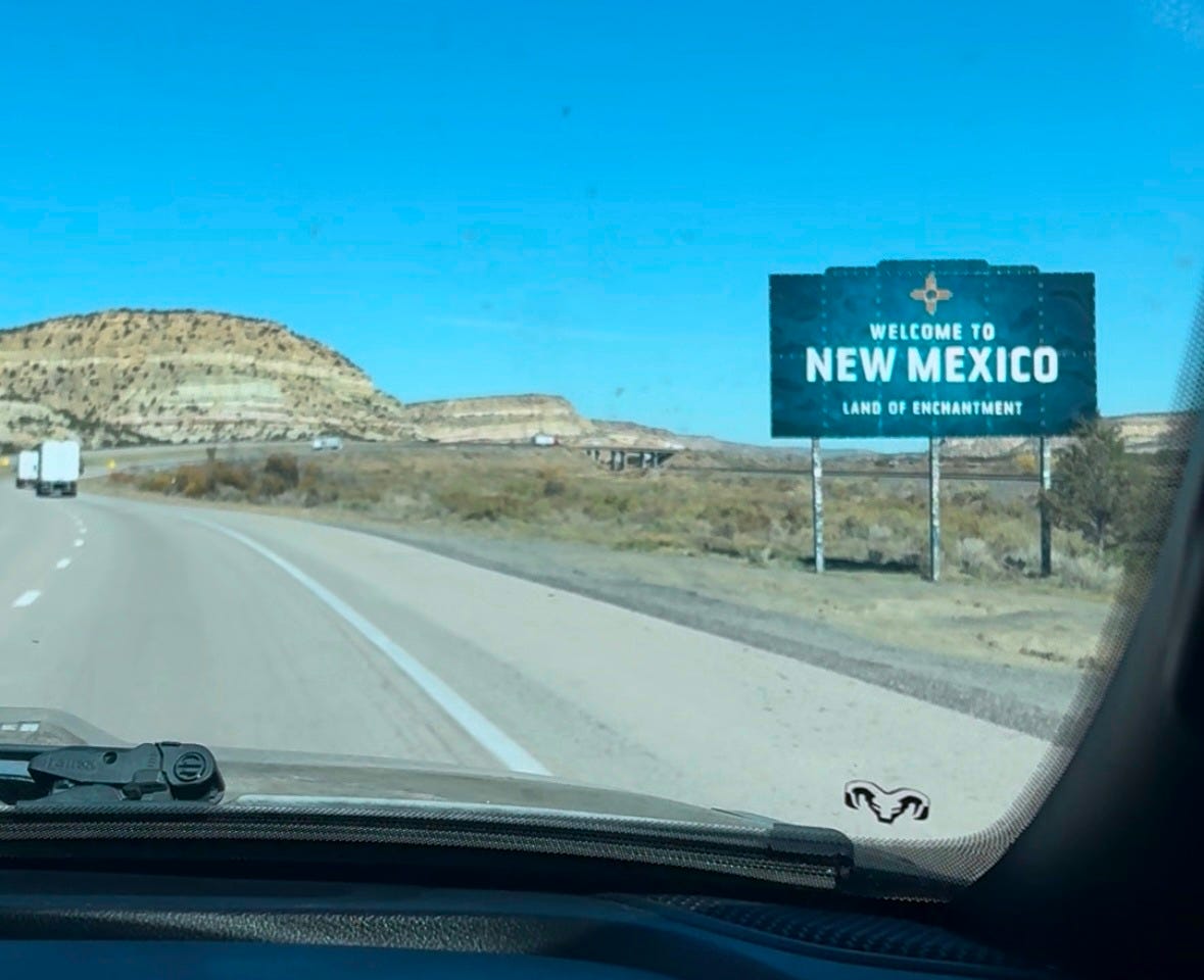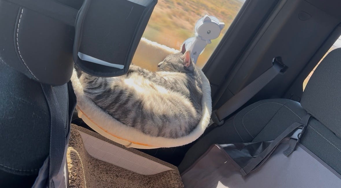 We were thirty miles west of Albuquerque when the semi-truck we’d been tailing since the state border started to lose speed, hissing to a slow stop behind a queue of cars that had just spent the better part of the afternoon passing us. Thanks primarily to a shared 300 mgs of gabapentin and the warm embrace of the Southwestern sun, the cats – Tug Boat and Submarine – didn’t even flinch when I hit the brakes, the 3 ton Airstream towing behind us shimmying only slightly as we settled to rest. My husband and I craned our necks as best we could, foreheads pressed against our windows, but it didn’t matter: the desert stretched out endless, unobstructed, and flat in every direction but the one we were headed, and there was just no way to see what was blocking our way forward.