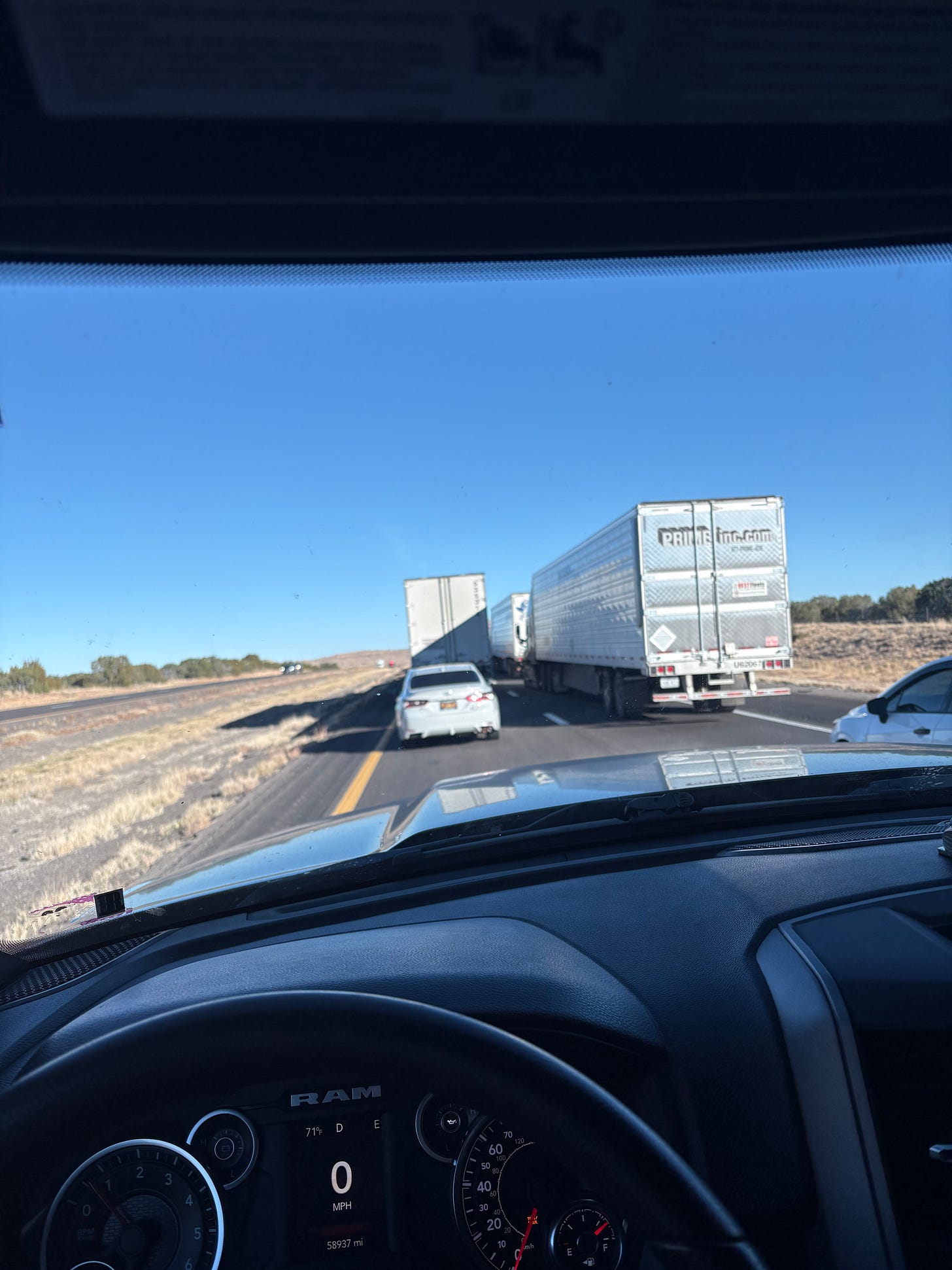A red F150 three cars ahead of us was the first to see the writing on the wall, and wasted no time swooping into the median that divided us from the I-40 West, kicking up a cloud of copper dust as he bounced across the dirt to the other side. It wasn’t long before a flurry of other vehicles joined him– a Subraru, a Prius, a Volkswagen– all approaching the severe dip of the highway’s DMZ with just a smidge more care than we’d seen from the truck. Unburdened by the need for patience, they left the rest of us in their rearview mirrors and sped back the way we’d come.