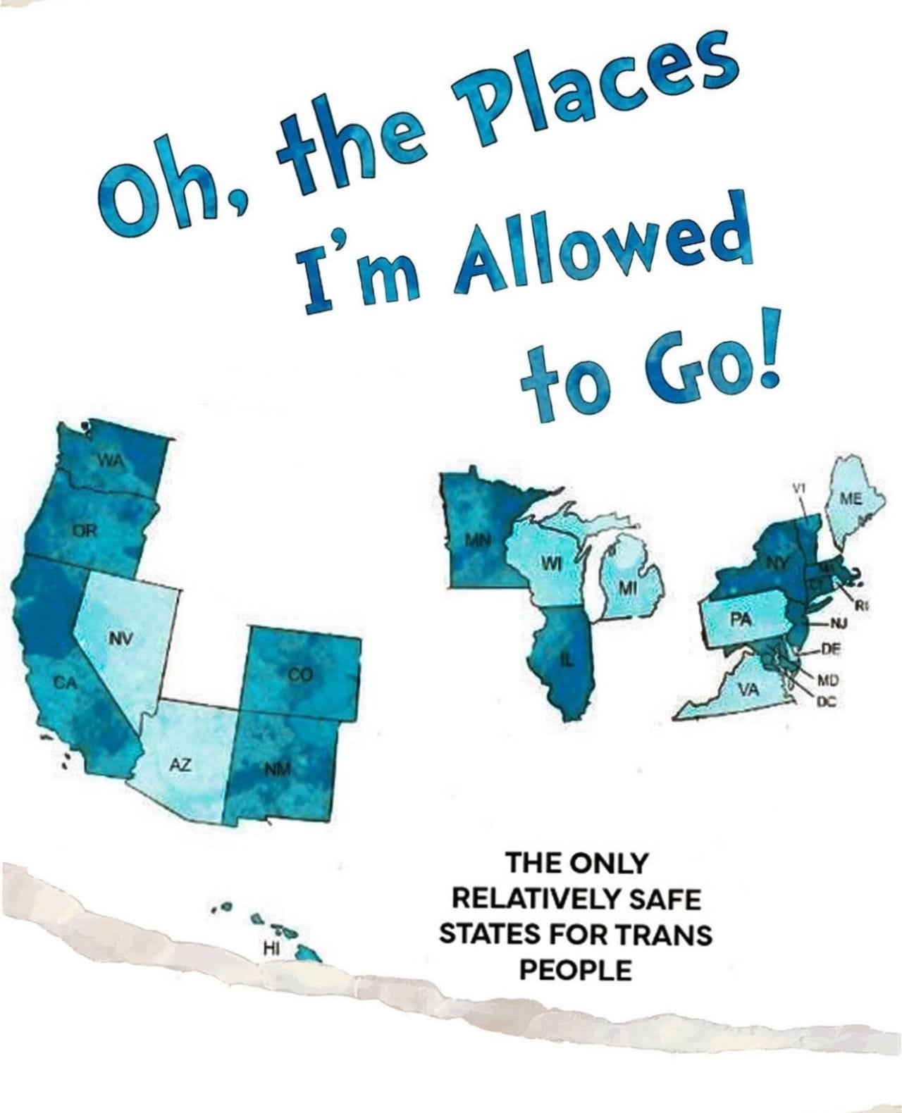 You’ve definitely seen it: a partially obscured map of the continental United States (plus Hawaii), painted in dreamy blue water colors and paired with a play on the Dr. Seuss classic title “Oh, the Places You’ll Go!” The title has been altered, and now reads “Oh, the Places I’m Allowed to Go!” The bottom of the image clears up any remaining confusion. The map depicts “the only relatively safe states for trans people.” If you count up the states on the map, there are 22– just shy of half the union. It gets even more depressing when you factor in that the image first circulated more than 18 months ago– well before the earth shifted on its axis and started sliding directly into the sun.