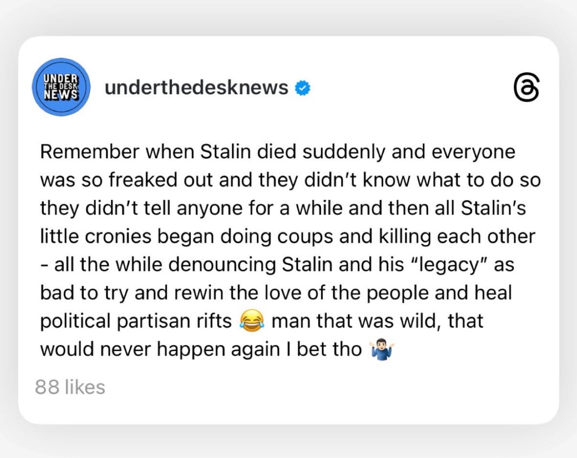 I made my own video about the higgledy-piggledy right away, when we were starting to learn that he might maybe be okay perhaps, where I asked my followers (and now 400,000 other strangers across two platforms) what song we should get ready to launch to the top of the US charts, in the same way that the UK made “Ding Dong the Witch is Dead” an iTunes bestseller after the 2013 passing of Margaret Thatcher. The playlist I made with suggestions is now almost three hours long, and I average another 15 recs every two to three minutes.